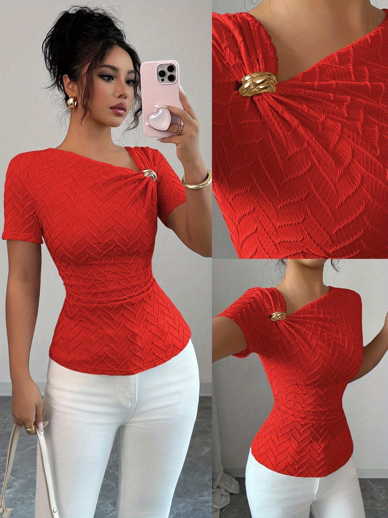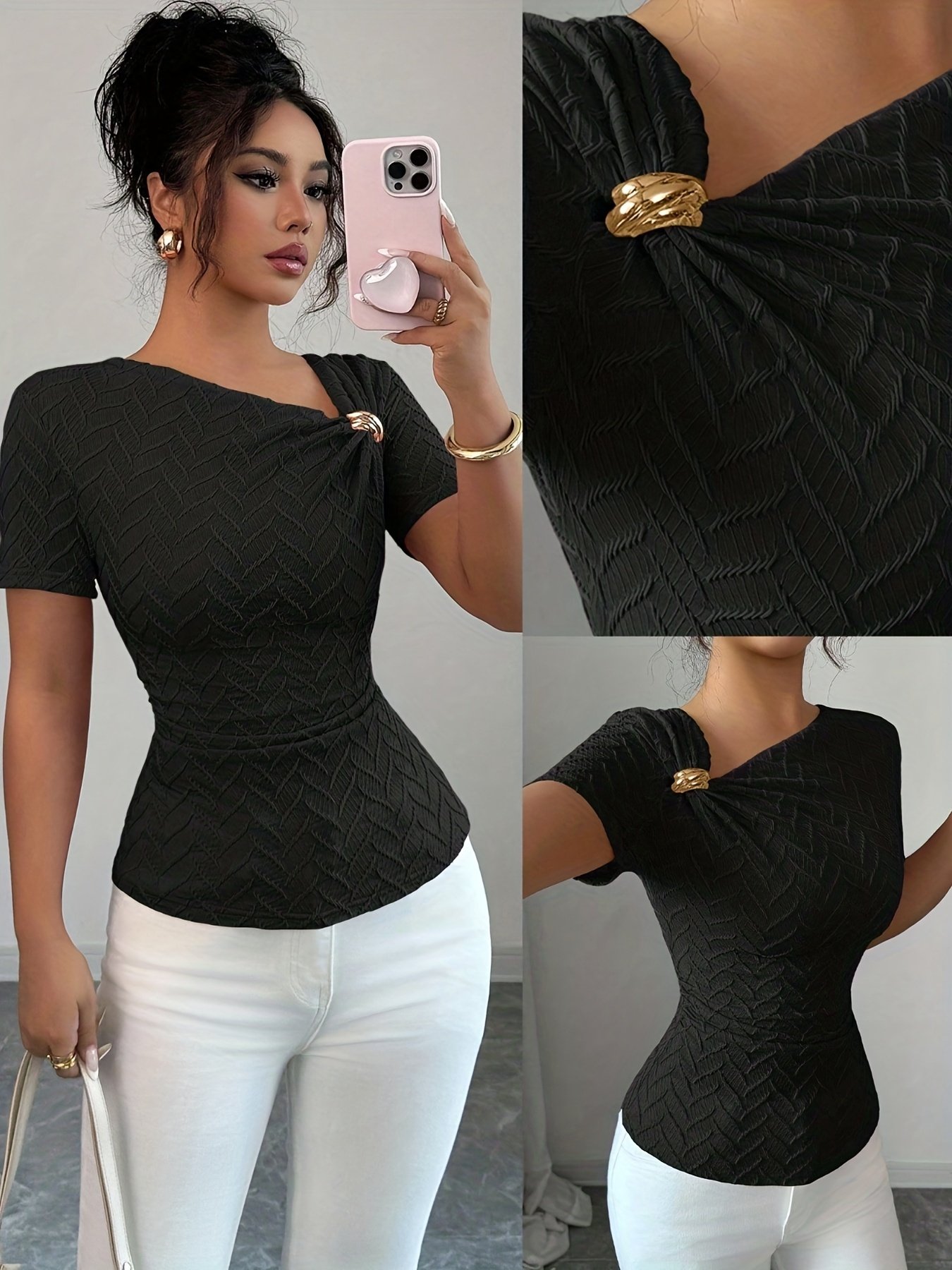 Elegant Women’S Short-Sleeve T-Shirt with an Irregular Neckline And Metal Buckle Decoration.