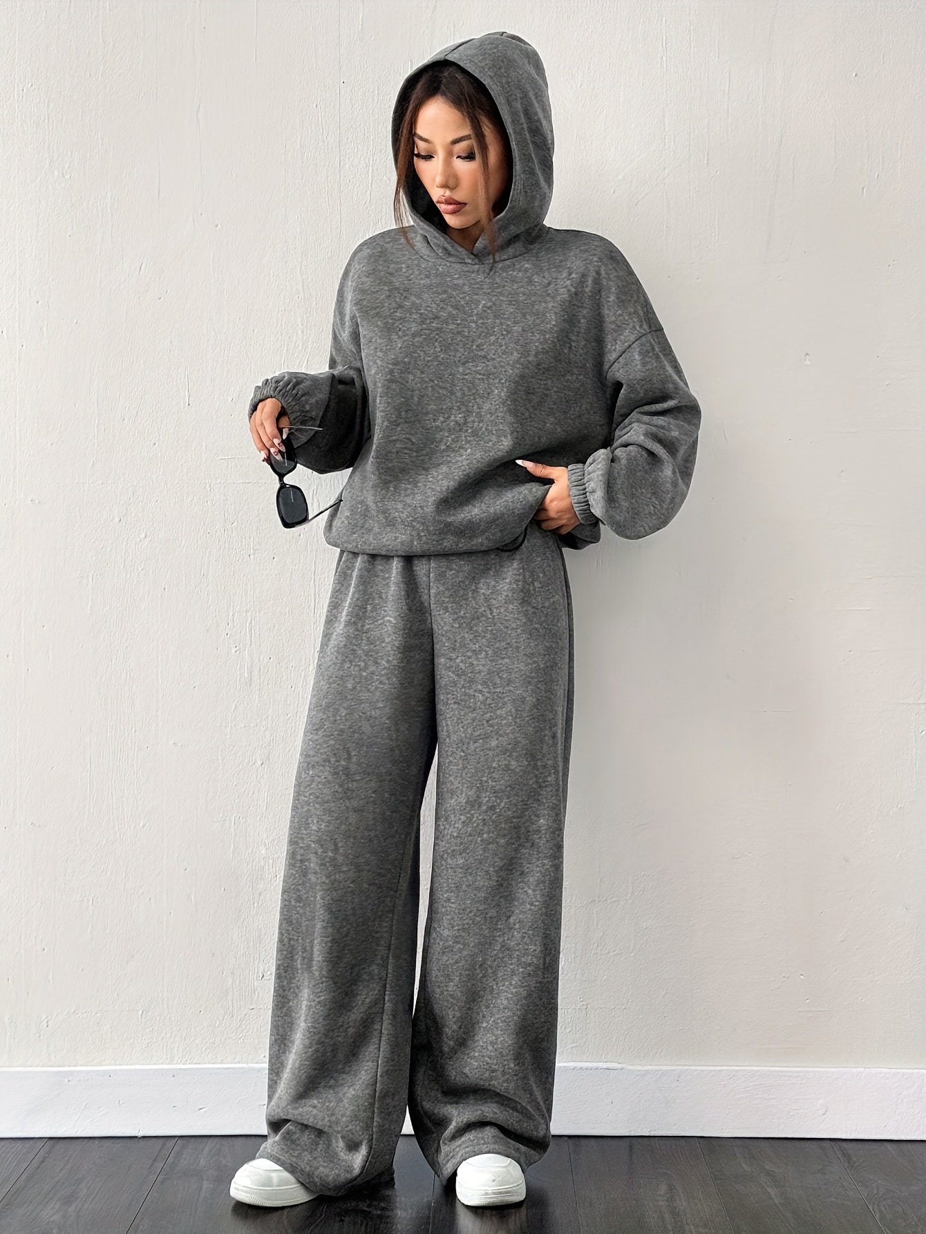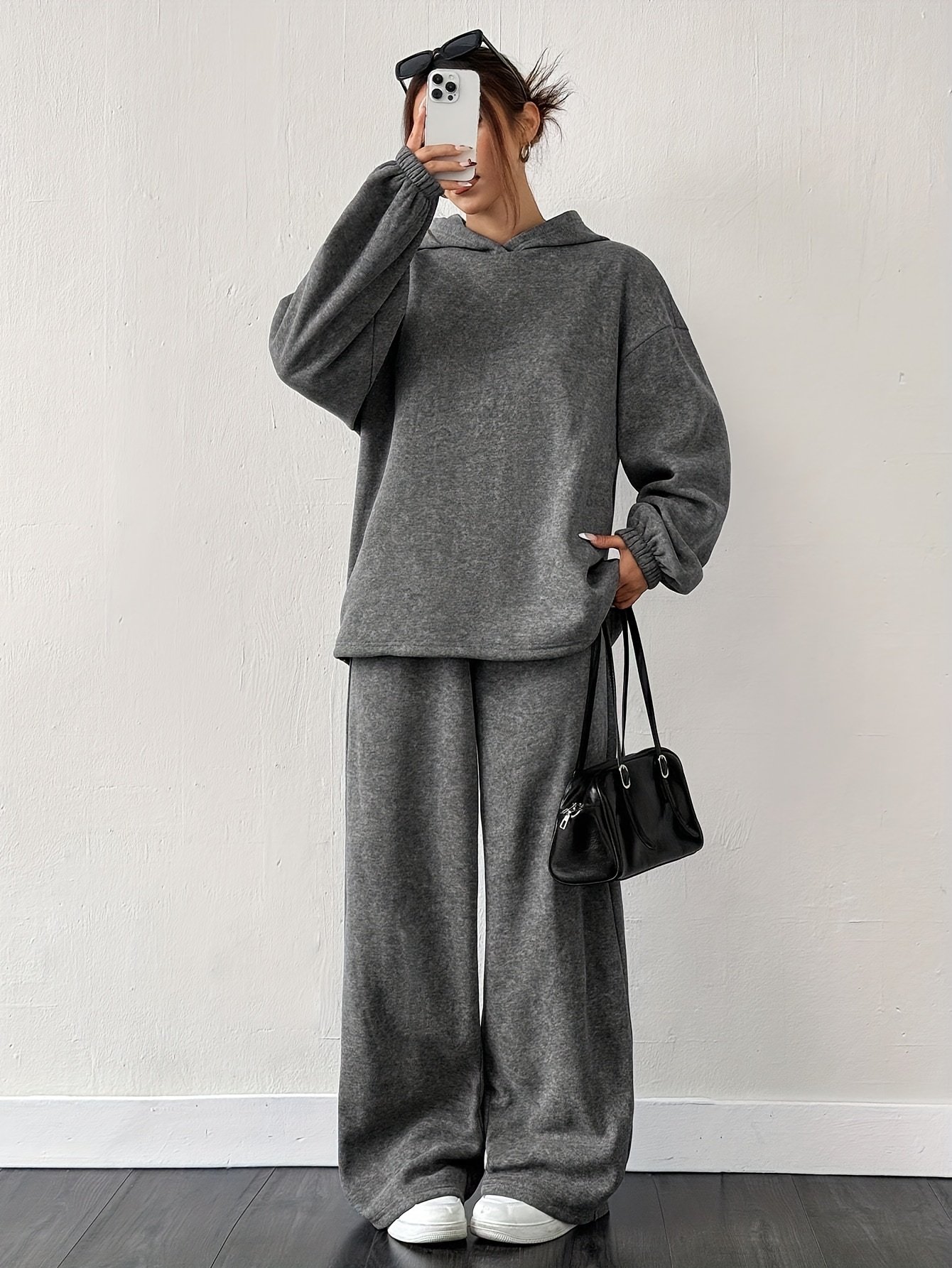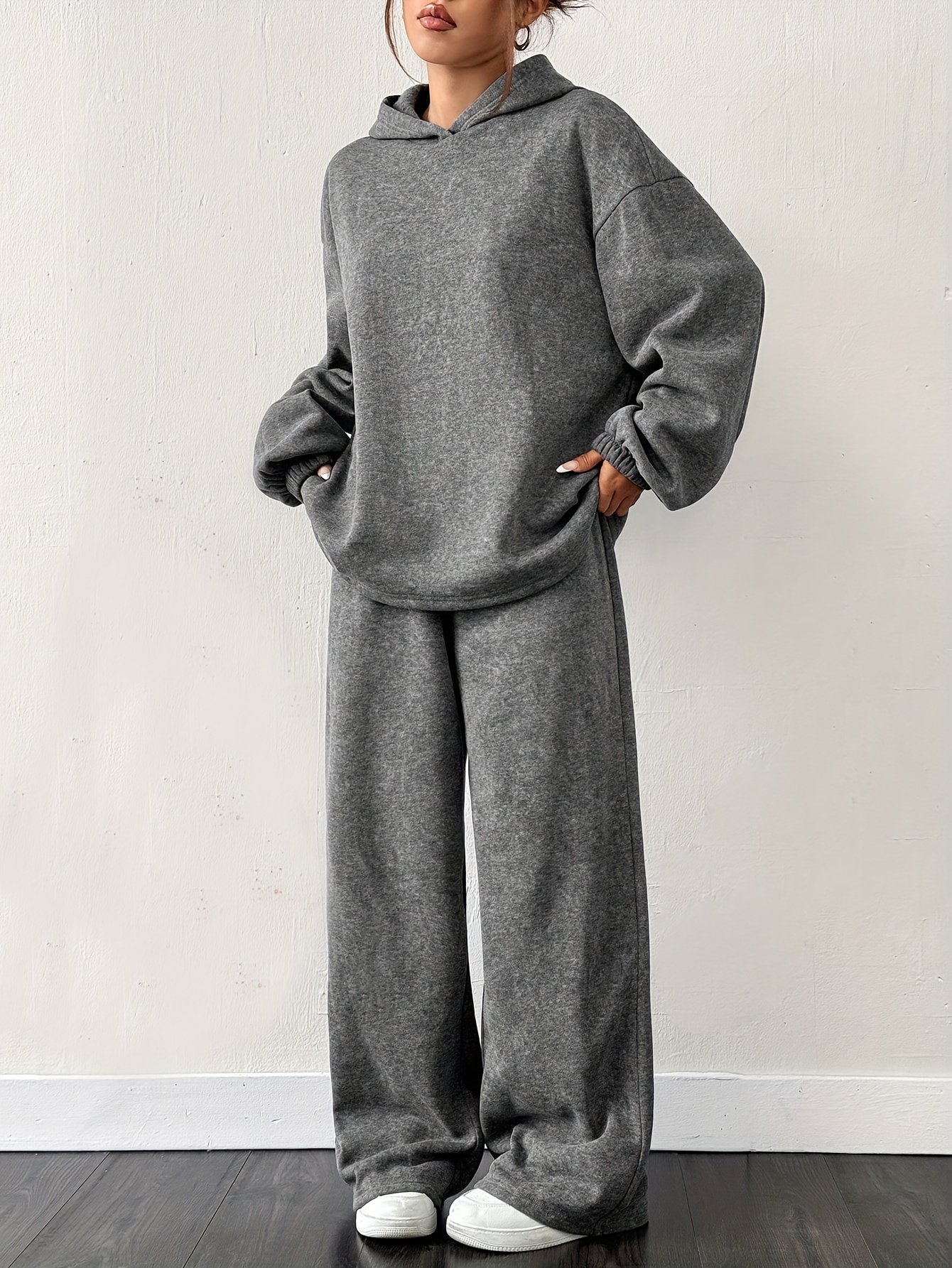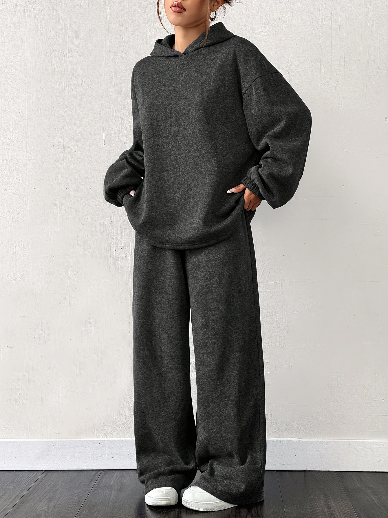 Fashionable Autumn And Winter Two-Piece Set Featuring an Oversized Hooded Sweatshirt with Warm Lining And Wide-Leg Sweatpants.