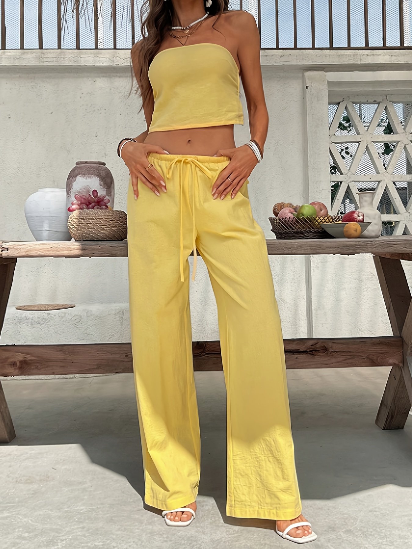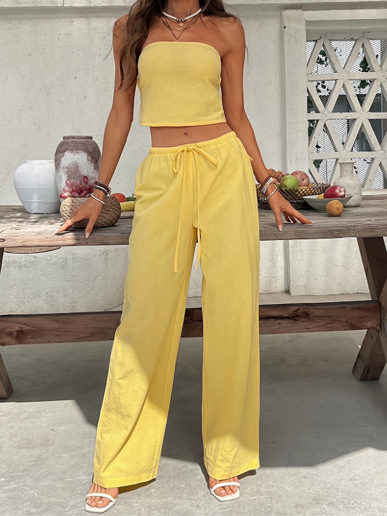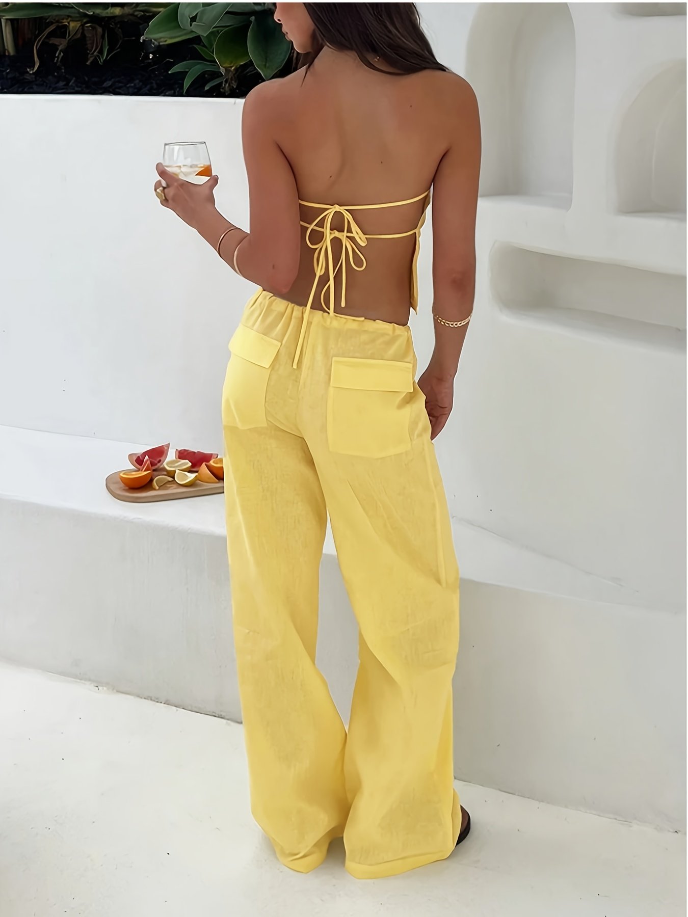 Summer Women’S Solid Color Strapless Backless Crop Top with High-Waisted Wide-Leg Pants, a Two-Piece Bohemian Style Outfit for Ladies, Perfect for Vacations And Beach Outings.
