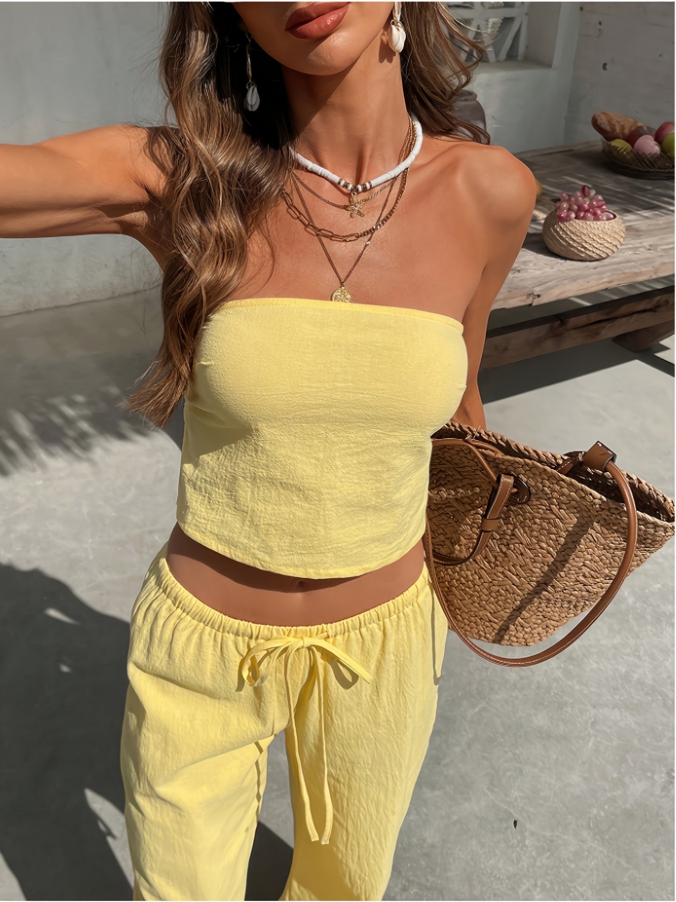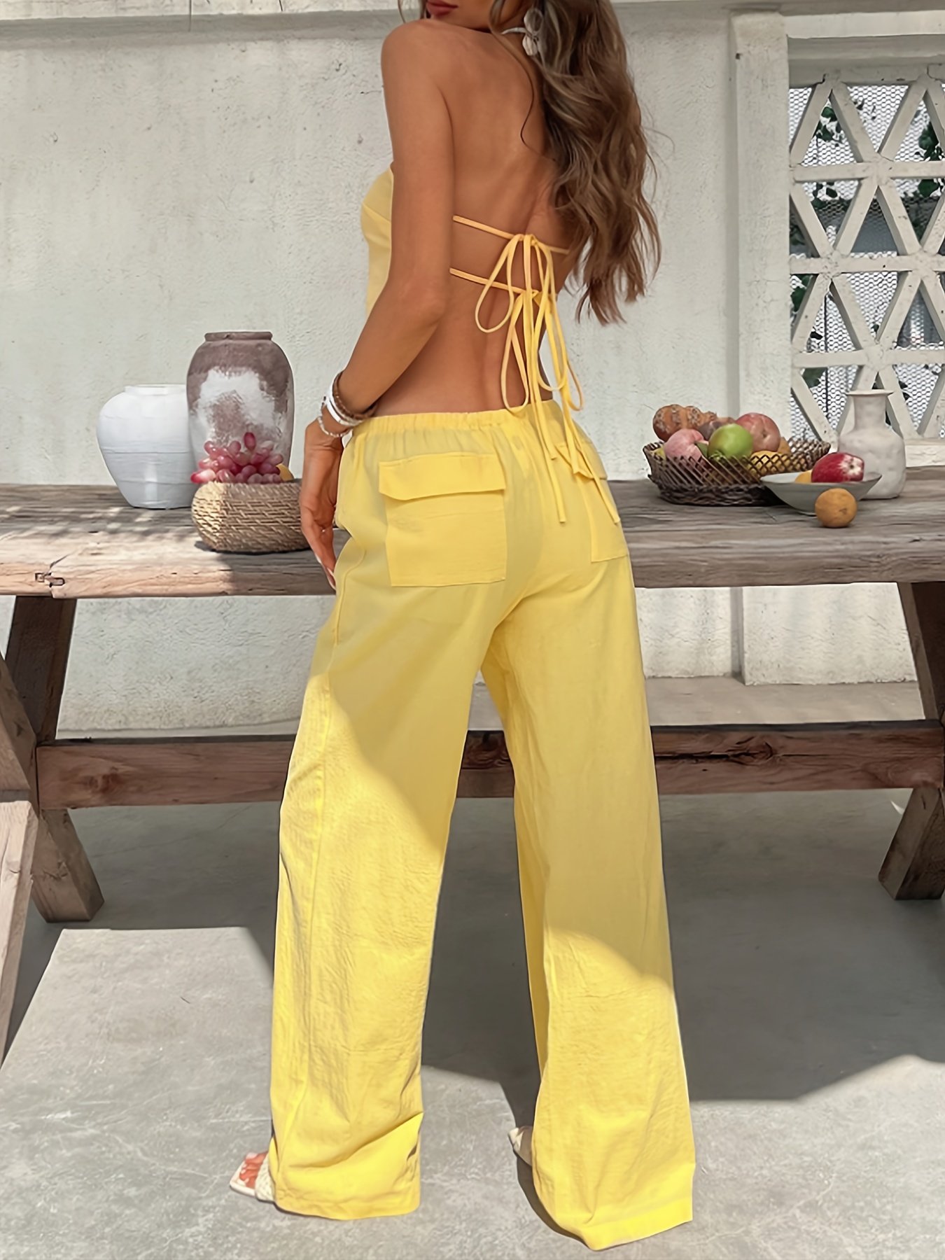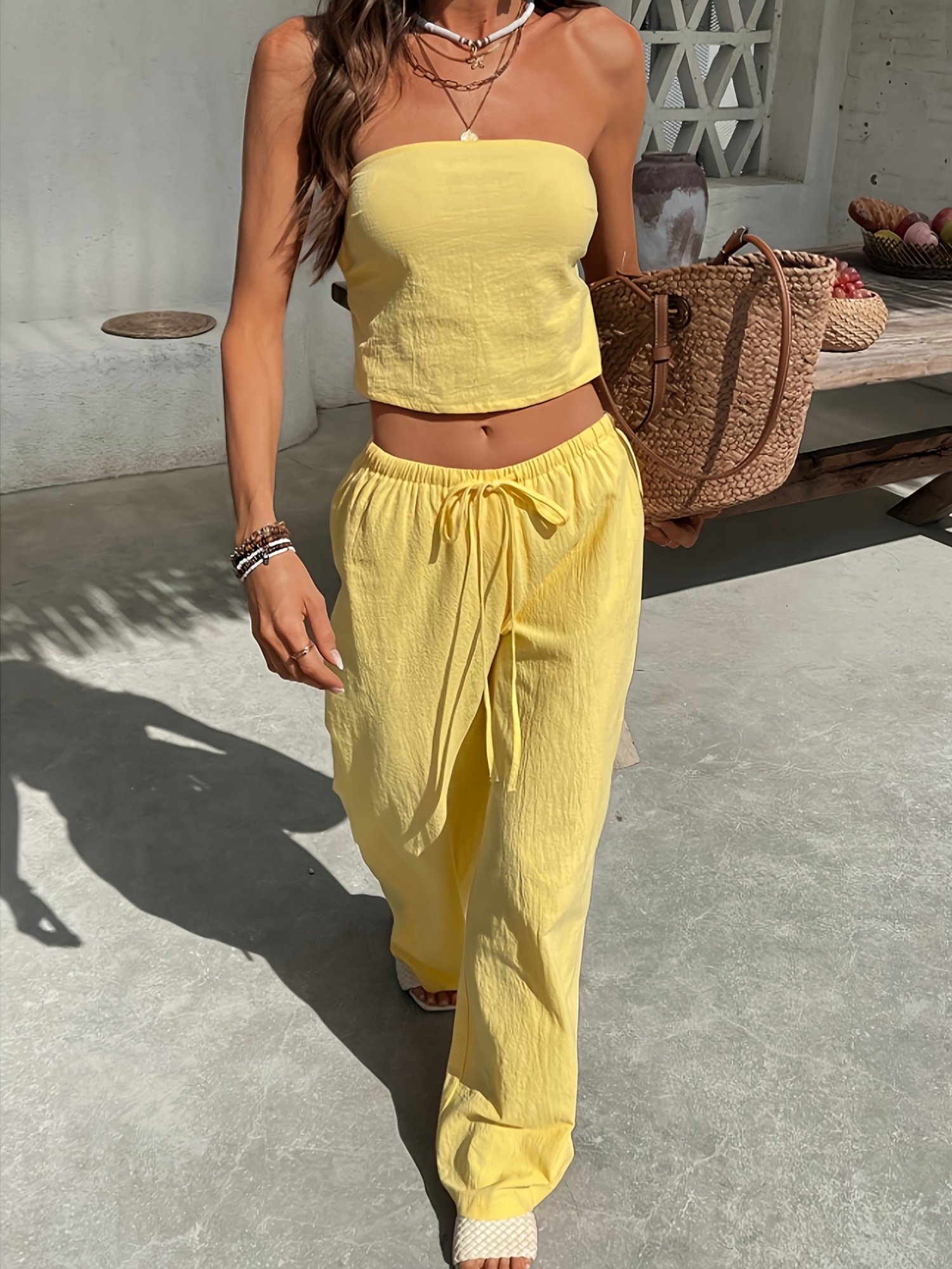 Summer Women’S Solid Color Strapless Backless Crop Top with High-Waisted Wide-Leg Pants, a Two-Piece Bohemian Style Outfit for Ladies, Perfect for Vacations And Beach Outings.