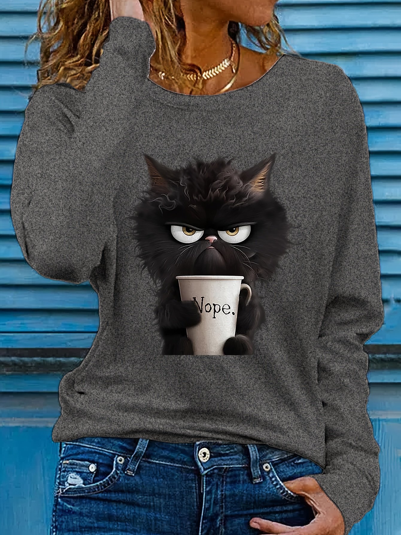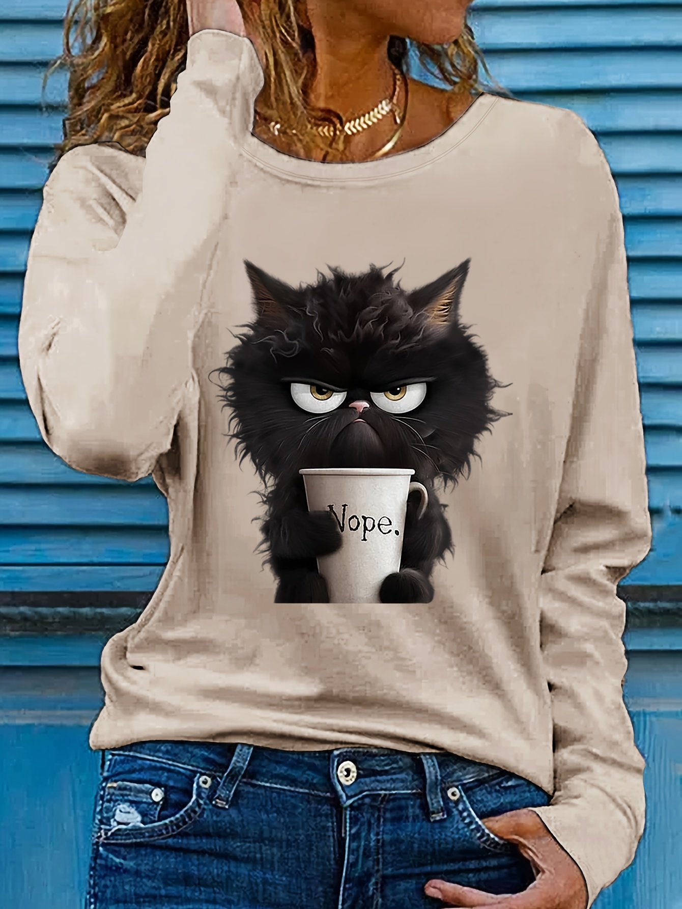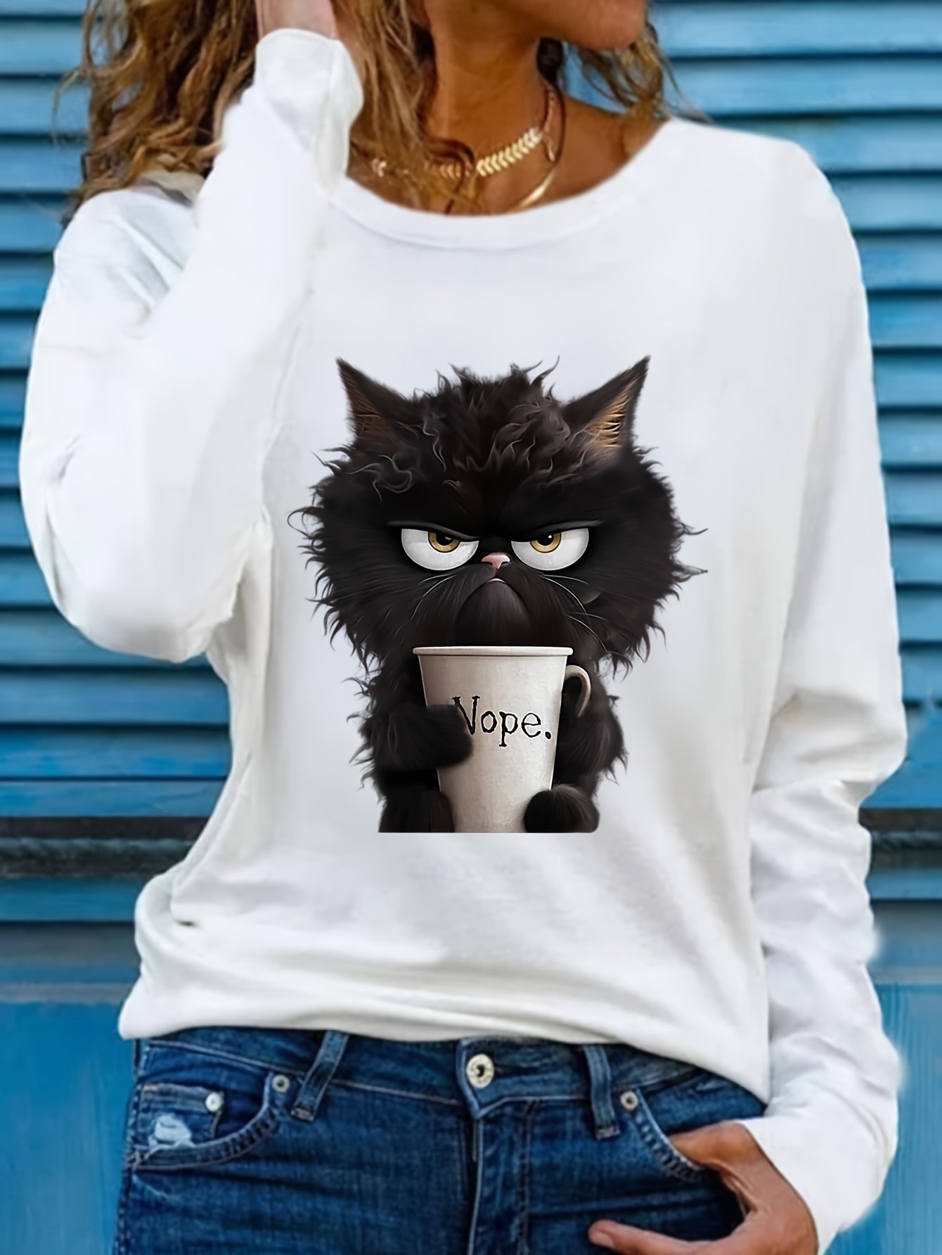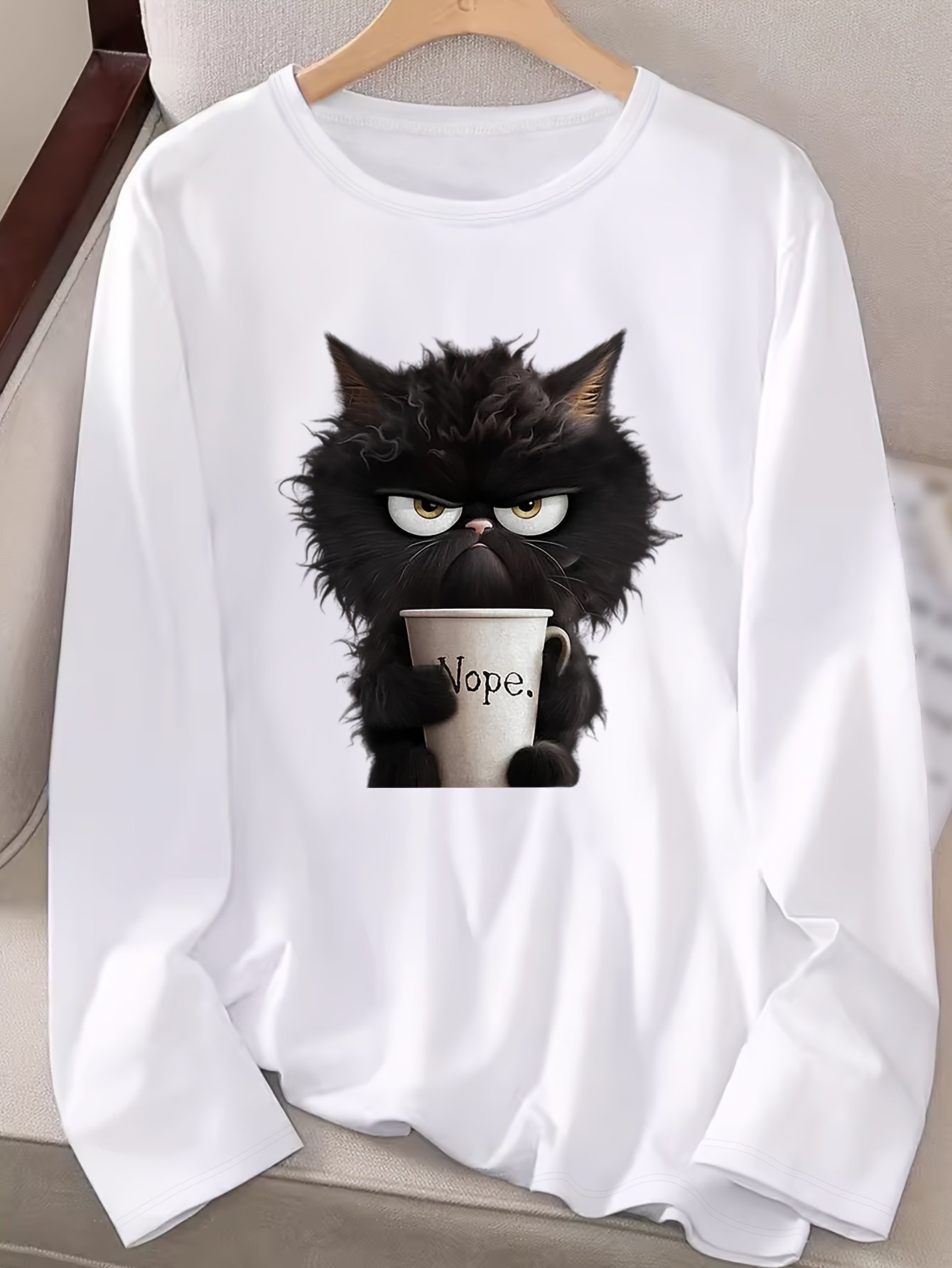 Women’S Cartoon Cat Graphic Tee, Long Sleeve Crew Neck Casual Top, 100% Polyester Knit Fabric, Applique Detail, Regular Length, Fall Season Fashion